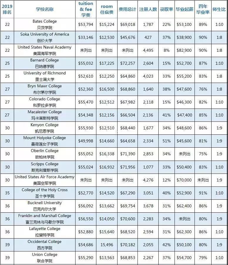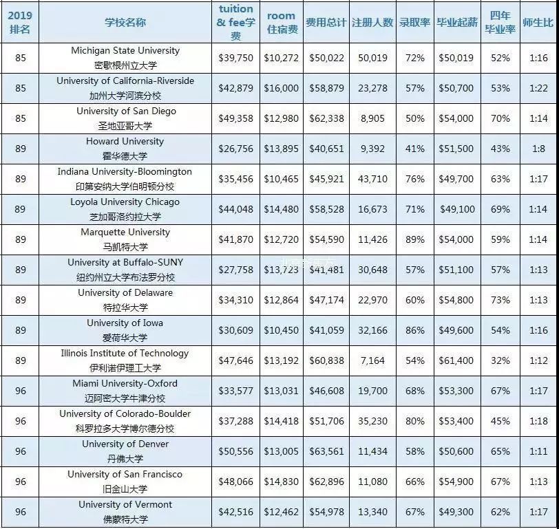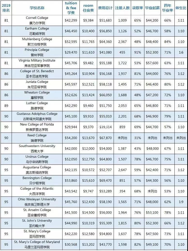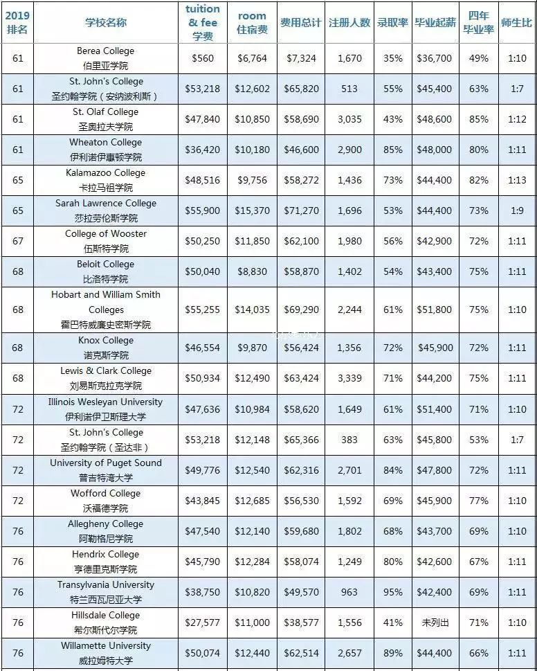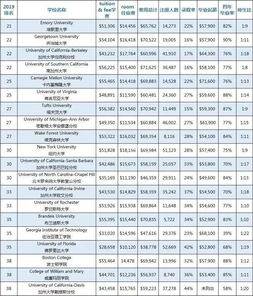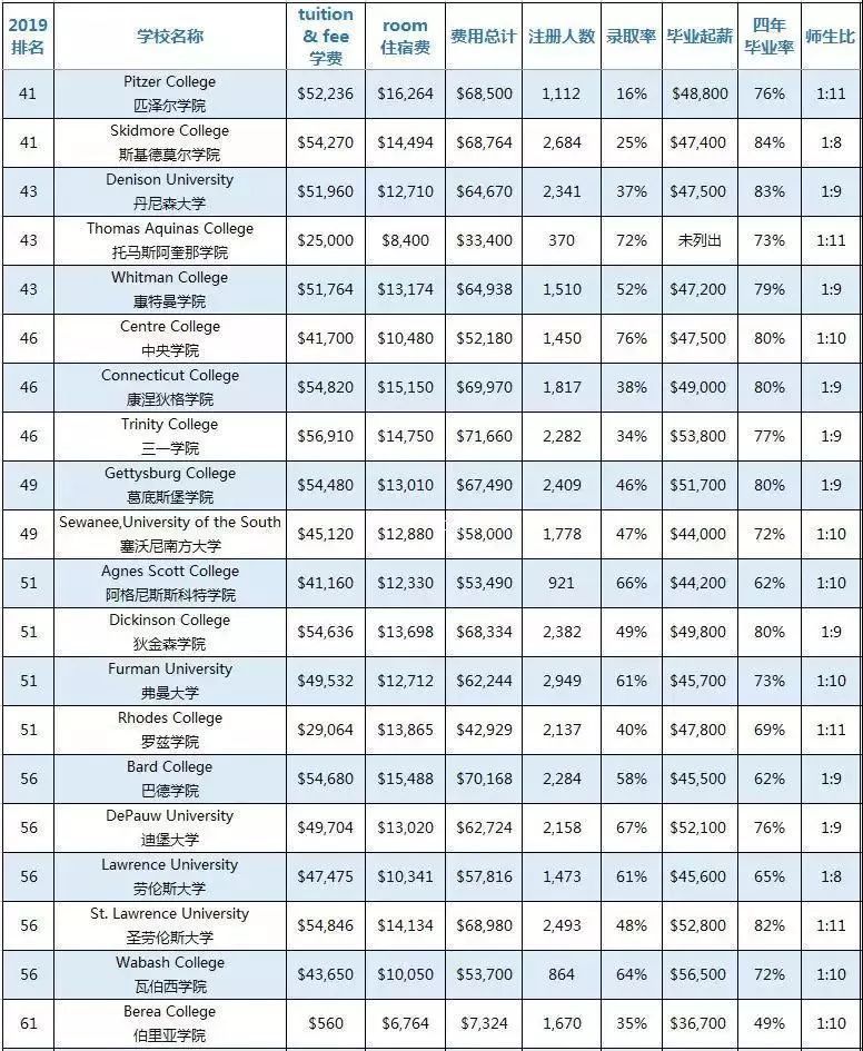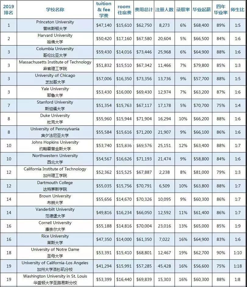 此次榜单分为“综合性大学”和“文理学院”,全部数据均来源于“U.S.News & World Report”并囊括了学费、住宿费、费用总计、本科注册人数、录取率、毕业生中位数起薪、四年毕业率、师生比8大类,供大家参考。